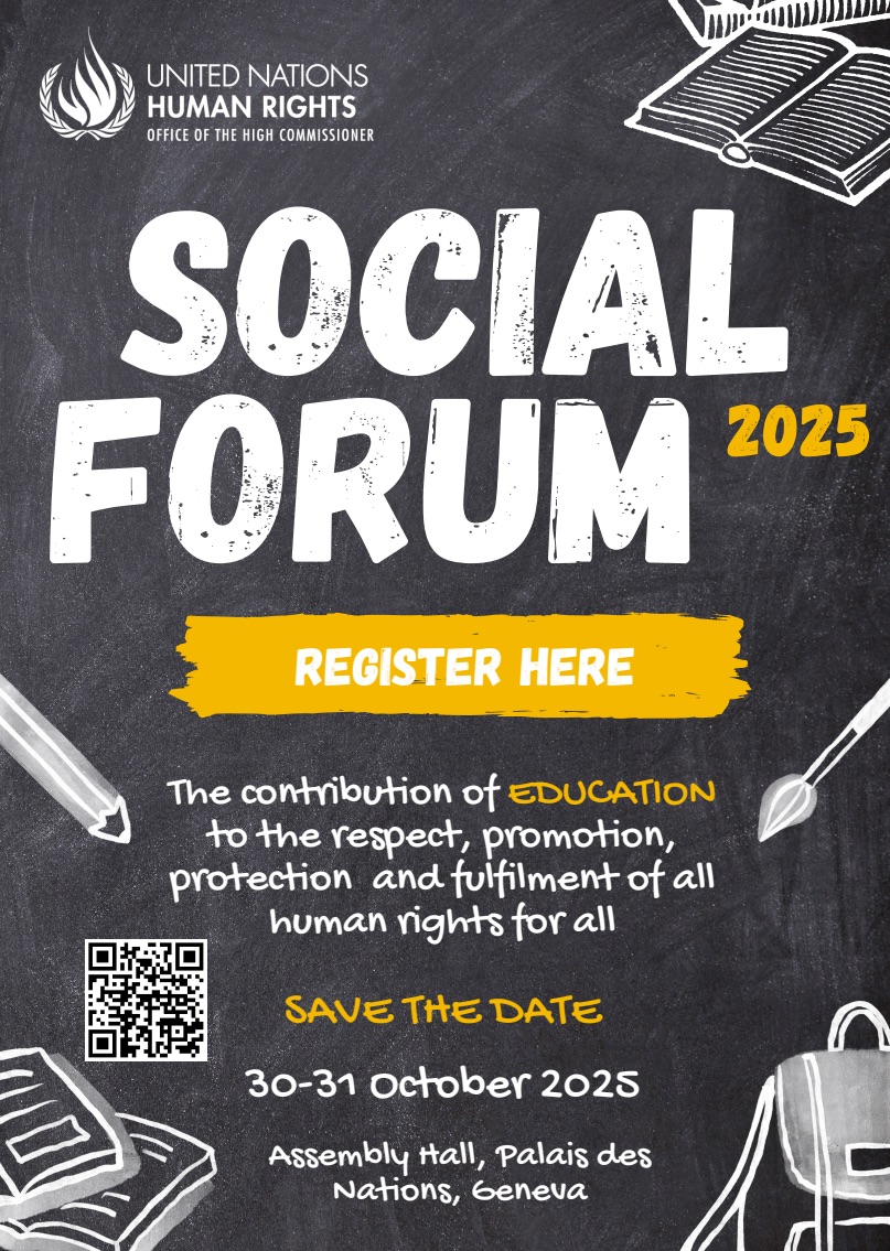 On 30 and 31 October 2025, the UN Human Rights Council will hold its Social Forum in Geneva with a focus on the contribution of education to the respect, promotion, protection and fulfilment of all human rights for all.