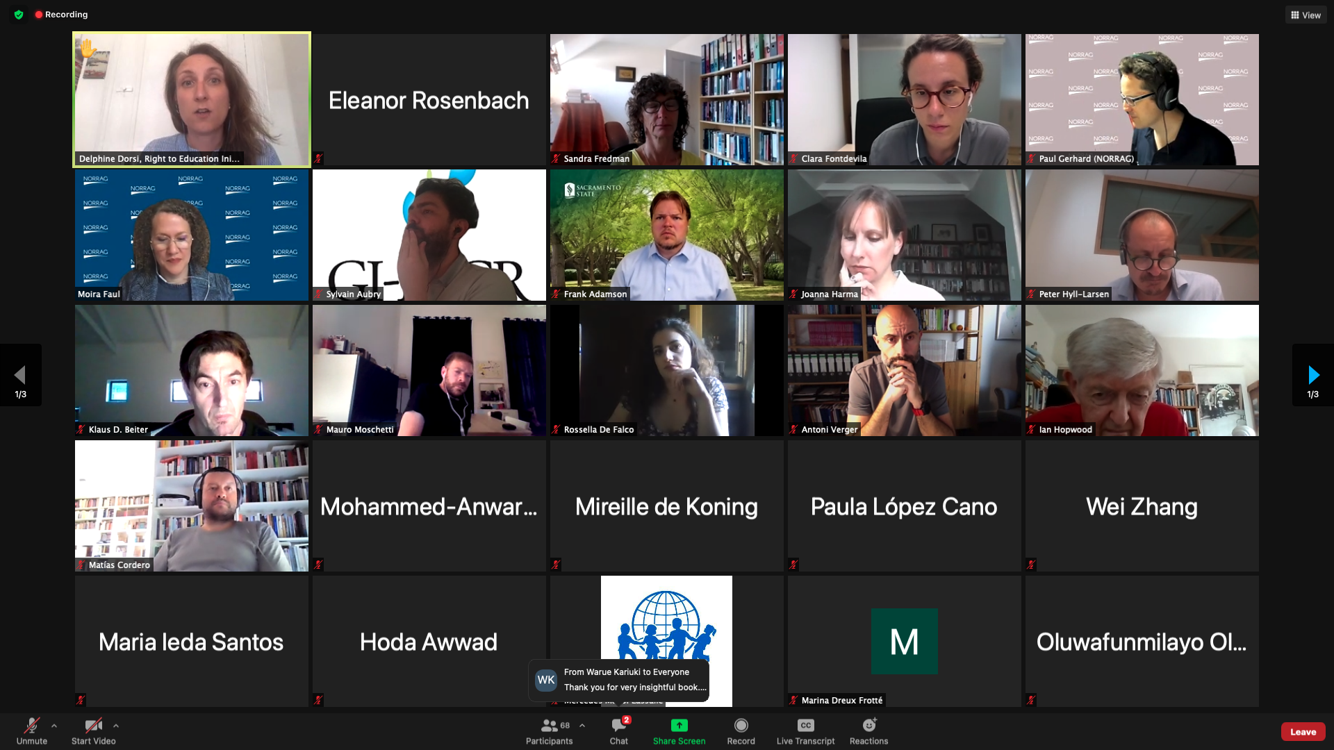 More than 100 people joined the online event to hear chapter authors and editors present the most salient and crucial aspects of their work in two minutes or less. The discussion which followed emphasised the varied challenges and developments in different national and educational contexts with regards the defense and protection of the right to education.