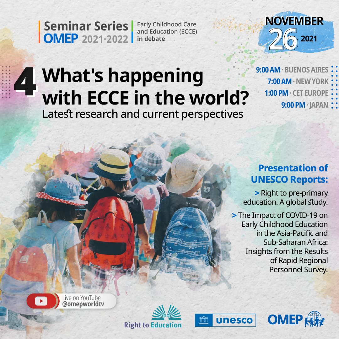 On Friday 26 November 2021, The World Organisation for Early Childhood Education (OMEP),  in association with the Right to Education Initiative and UNESCO, organised a seminar entitled ‘What’s happening with ECCE in the world? Latest research and current perspectives’. This seminar, which is part of OMEP’s 2021-22 series, featured the presentation of two new UNESCO reports.
