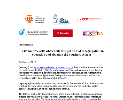 The list of issues presented by the CRC follows a report from a coalition of Chilean and international organizations raising concerns about the effect of privatization in education in Chile on the realization of human rights. The report was prepared by the Sciences Po Paris Law School Human Rights Clinic and the Global Initiative for Economic, Social and Cultural Rights, working in partnership with the Foro por el Derecho a la Educación, the Red de Estudios para la profundización Democrática, the LatinAmerican Campaign for the Right to Education, the Privatisation in Education Research Initiative, the Right to Education Project, Education International, the Global Campaign for Education, and the Equal Education Law Centre.