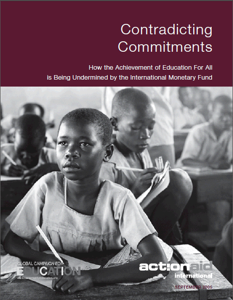 This paper intends to demonstrate the International Monetary Fund’s (IMF) role in constraining countries from increasing public expenditure in education to meet the Education For All (EFA) goals and the education-related Millennium Development Goals (MDGs). The findings are based on research and country case studies undertaken by ActionAid International offices in Guatemala, Bangladesh, India, Cameroon, Ethiopia, Kenya, Nigeria and Sierra Leone during 2004-05. These findings are complemented by similar research by the Global Campaign for Education GCE.