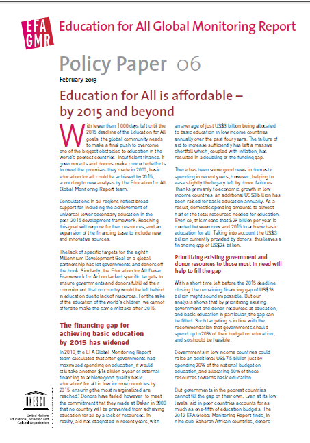 This policy paper provides analysis showing that if governments and donors make concerted efforts to meet the promises they made in 2000, basic education for all could be achieved by 2015.