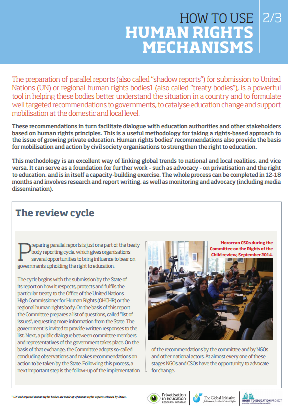 There is a unique opportunity for civil society to tackle complex issues of privatisation in education by using this framework. The methodology can easily be replicated by your coalition, even if you have no experience using human rights mechanisms. This 3-part series explains this work in more detail and how your coalition can get involved. The documents are designed as an introduction.
