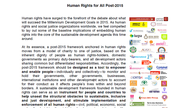 Published on International Human Rights Day, the joint statement "Human Rights for All Post-2015" was presented to the Open Working Group (OWG) on the Sustainable Development Goals (SDGs) at its 6th session. It sets out 10 practical, baseline implications of embedding existing human rights standards into the core of the sustainable development agenda.