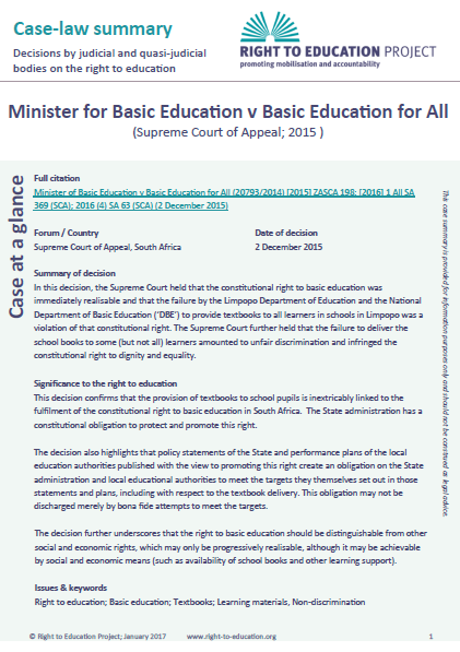 This case involves the interpretation of the scope of the constitutional right in South Africa to basic education and in particular whether the provision of school textbooks to all basic education learners for the whole academic year is an essential component of this right.