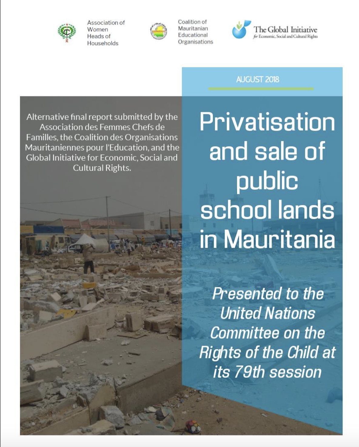 This report, conducted in the context of Mauritania's review by the UN Committee on the Rights of the Child, seeks to advance the discussion and analysis of the privatisation of education in Mauritania. It examines the inroads made by private stakeholders in this region, and their impact. The report analyses existing available data and field data collected in a small-scale study against the five accepted human rights standards for measuring the impact of private stakeholders in education: non-discrimination, the right to free education, the protection of education against its commercialisation, regulation, and participation.